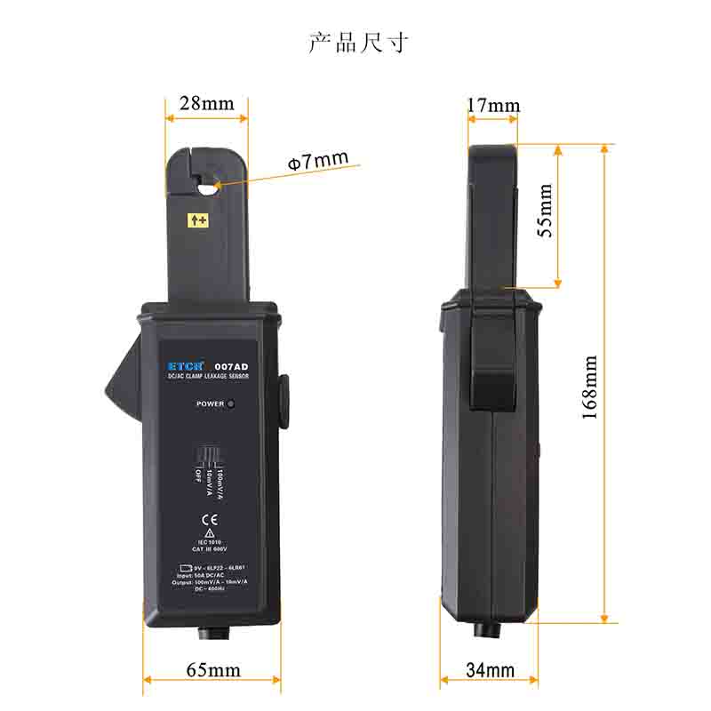 ETCR007AD | ![]() | 量程: 0mA~50A AC/DC 精度等級:3 相位誤差:≤3° 工作頻率:DC~400Hz | 10mV/1A或100mV/1A(手動換擋) | Ф7mm | 168mm×65mm×34mm | 170g |