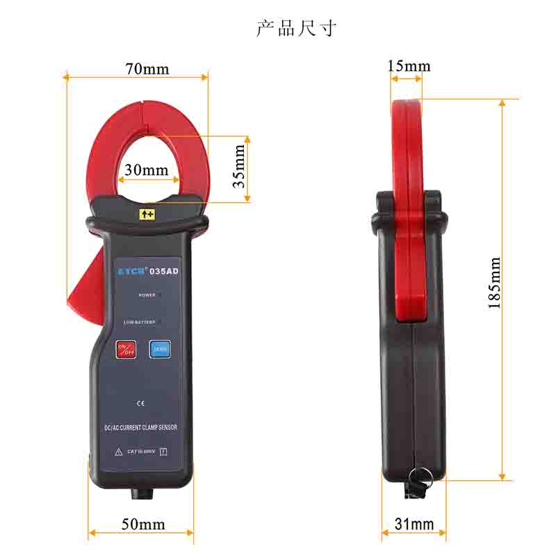 ETCR035AD | ![]() | 量程: 0.0A~1000A AC/DC 精度等級:2 相位誤差:≤3° 工作頻率:DC~400Hz | 1mV/1A | 30mm×35mm | 122mm×70mm×33mm | 180g |