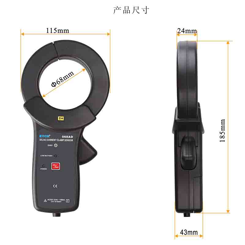 ETCR068AD | ![]() | 量程: 0.0A~1500A AC/DC 精度等級:3 相位誤差:≤3° 工作頻率:DC~400Hz | 1mV/1A | Ф68mm | 224mm×115mm×43mm | 515g |