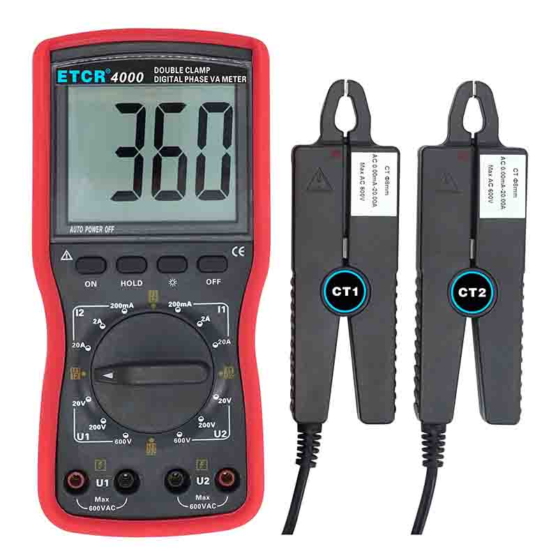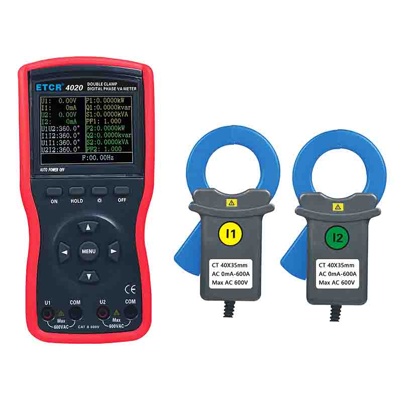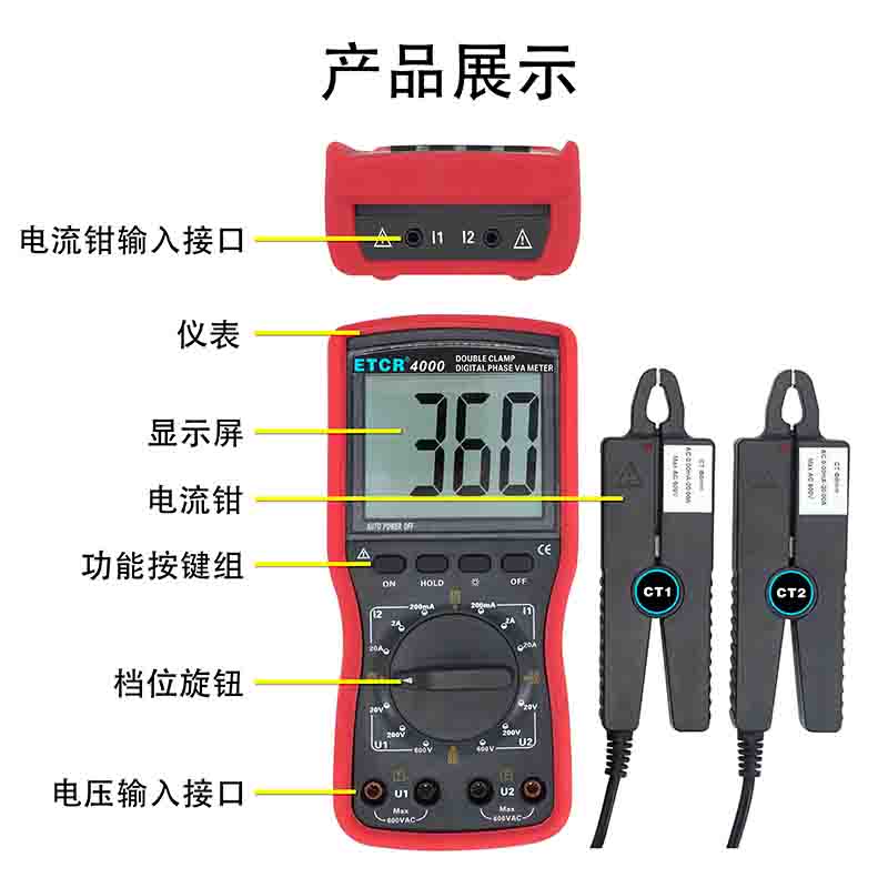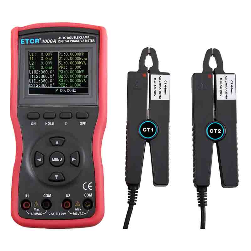 | ETCR4000數(shù)字雙鉗相位伏安表 | Φ8mm | 0~360° | 0.00V~600V | 0.0mA~20.0A | -- |