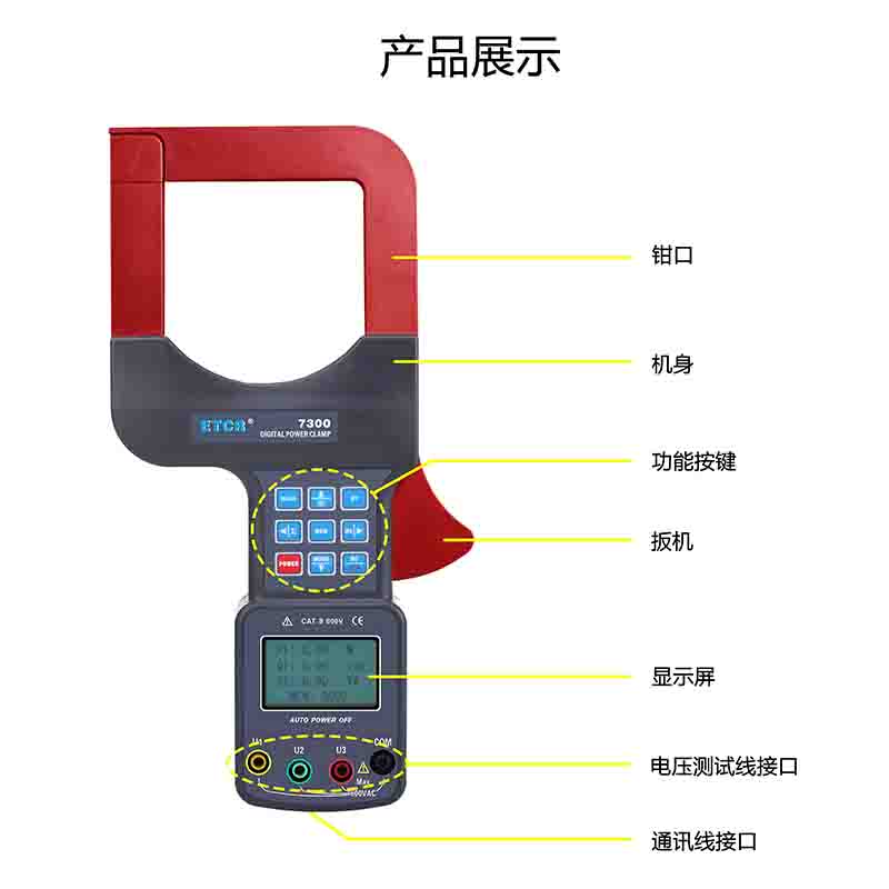 ETCR7300大口徑三相鉗形功率表又名鉗形功率計(jì)、超大口徑鉗形功率表、三相鉗形功率表,用于現(xiàn)場(chǎng)測(cè)量三相交流電壓、電流、漏電流、電壓間相位、電壓電流間相位、頻率、相序、電能、有功功率、無功功率、視在功率、功率因數(shù)、總功率等電能參數(shù)。還能用于判別變壓器接線組別、感性、容性電路,讀出差動(dòng)保護(hù)各組CT之間的相位關(guān)系,檢查電度表的接線正確與否,檢修線路設(shè)備等,為用電檢查人員提供一種安全、準(zhǔn)確、便捷的新型電力儀表。