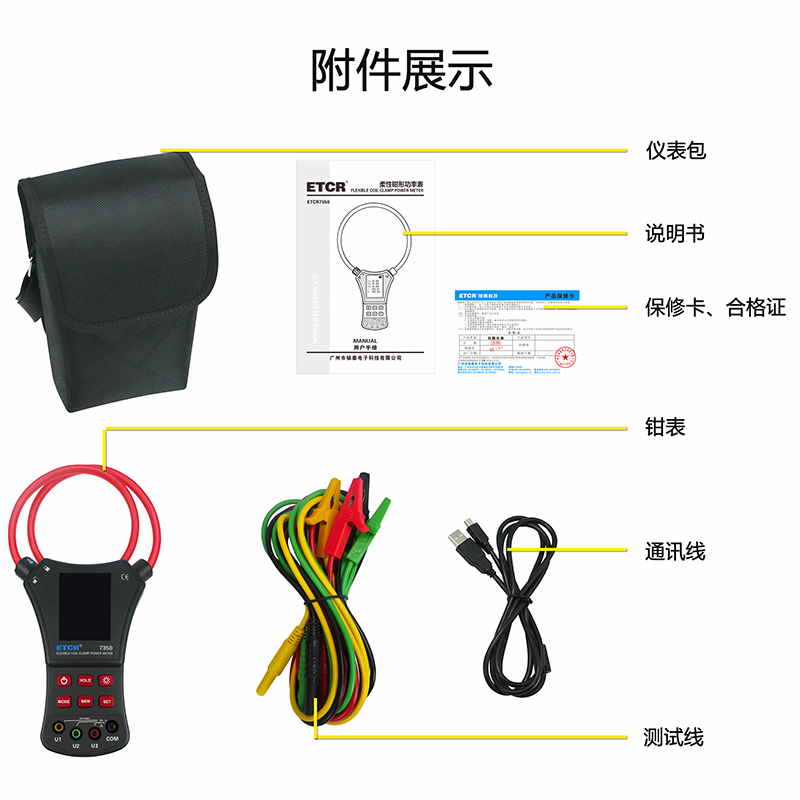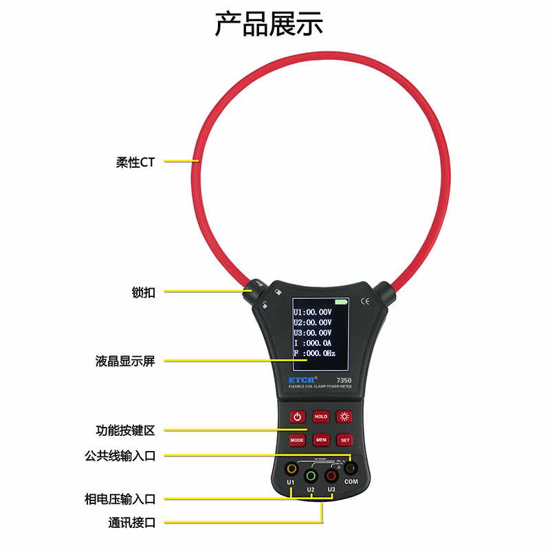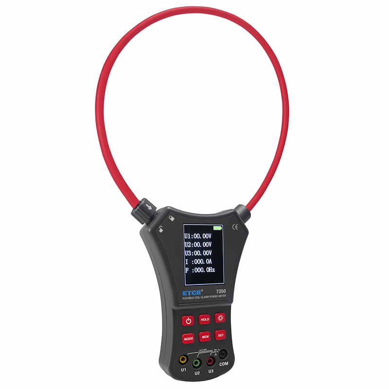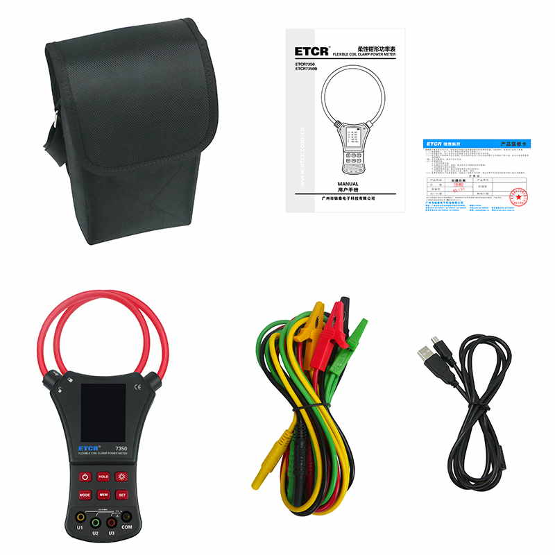 ETCR7350柔性鉗形功率表又名羅氏線圈功率表、洛氏線圈功率表,用于現(xiàn)場測量三相交流電壓、電流、電壓間相位、電壓電流間相位、頻率、相序、電能、有功功率、無功功率、視在功率、功率因數(shù)、總功率等電能參數(shù)。還能用于判別變壓器接線組別、感性、容性電路,讀出差動(dòng)保護(hù)各組CT之間的相位關(guān)系,檢查電度表的接線正確與否,檢修線路設(shè)備等,為用電檢查人員提供一種安全、準(zhǔn)確、便捷的新型電力儀表。