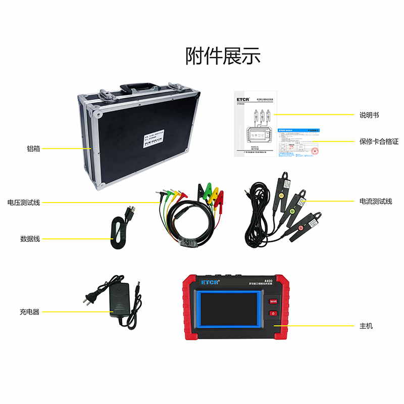 ETCR4400多功能三相相位伏安表由主機(jī)與電流鉗、電壓測(cè)試線組成。采用5寸觸摸彩屏、中文界面、功能直達(dá)、自動(dòng)測(cè)量、操作簡(jiǎn)易快捷,準(zhǔn)確可靠,同時(shí)儀表采用大容量可充電鋰電池、具有數(shù)據(jù)存儲(chǔ)、數(shù)據(jù)查閱、自動(dòng)關(guān)機(jī)、USB數(shù)據(jù)上傳導(dǎo)出等功能。由于本儀器采用專用計(jì)量芯片,所以本儀表具備非常高精度的電參數(shù)測(cè)量,能夠?qū)崟r(shí)顯示待測(cè)參數(shù)的變化,同時(shí)具備一鍵保存數(shù)據(jù)的功能。