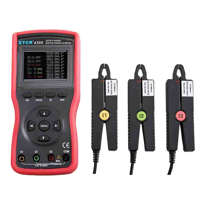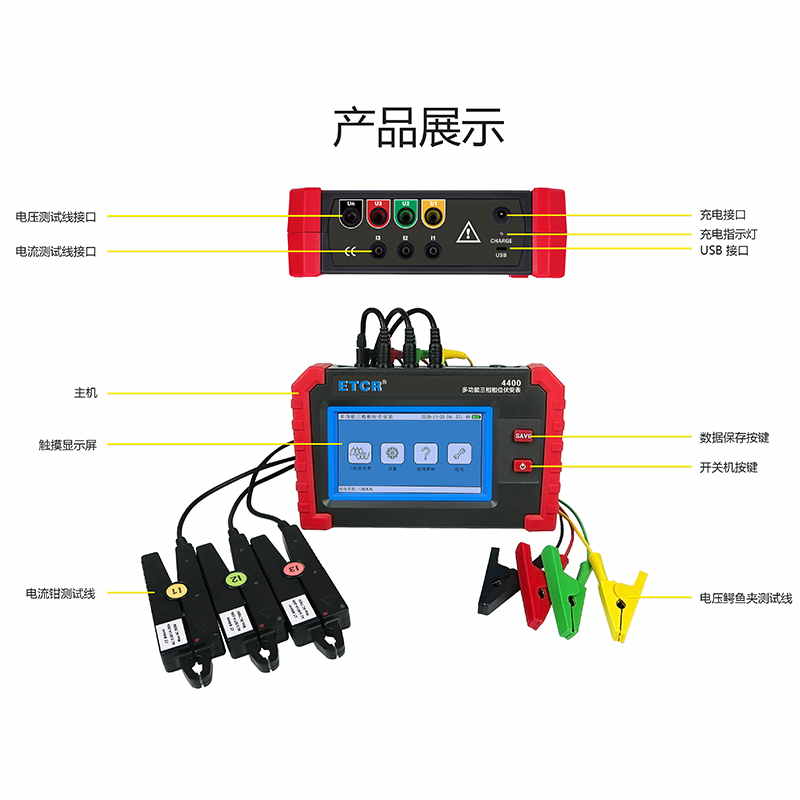ETCR4400多功能三相相位伏安表又稱三鉗相位伏安表、三相相位伏安測(cè)試儀、手持式相位測(cè)試儀、便攜式相位表 、矢量圖分析儀,,是一款觸摸屏的多功能儀表,可以測(cè)量電壓幅值、電流幅值、電壓相位、電流相位、頻率、功率、有功功率、無功功率、諧波,并且能夠?qū)崟r(shí)顯示三相電壓和三相電流的矢量圖。此外還可以判斷三相相序、感性、容性電路,測(cè)試二次回路,檢查電度表的接線正確與否,檢修線路設(shè)備等。本產(chǎn)品操作簡(jiǎn)單、使用方便、測(cè)量快速、穩(wěn)定、結(jié)果可靠。廣泛適用于電力、石油化工、冶金、鐵路、氣象等單位。